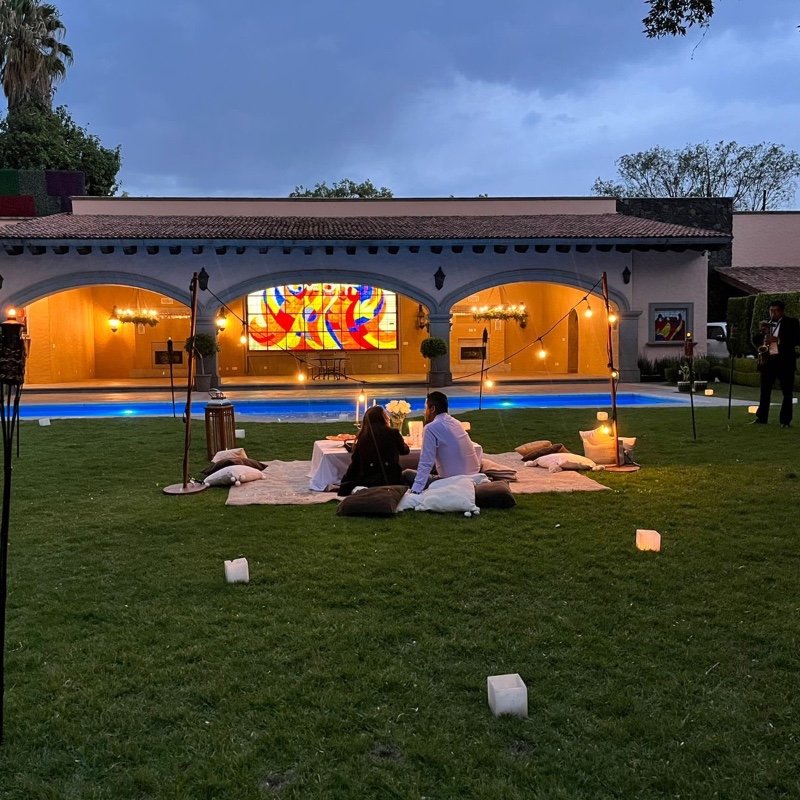 El jardín principal de una Hacienda inolvidable, un picnic con fondue y snacks, frente a Ustedes una pantalla de gran tamaño, una manera romántica de disfrutar una película, ¡que comience la función!